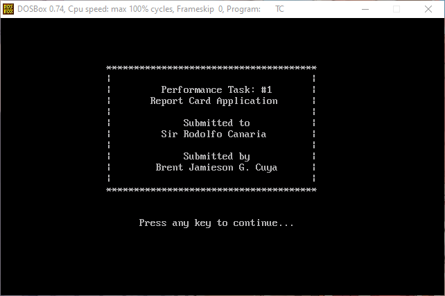 gotoxy(29, 14); cout << "Brent Jamieson G. Cuya";