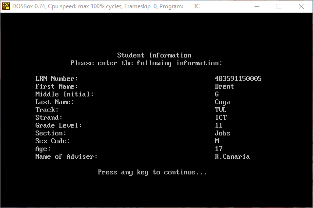 char lrnNum[13], firstName[20], lastName[15], middleInitial[2], track[10], strand[5], section[12], adviser[30], sexCode[2], gradeLevel[3], age[3];