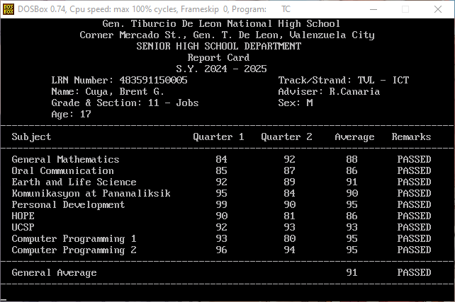 gotoxy(19, 2); cout << "Gen. Tiburcio De Leon National High School";