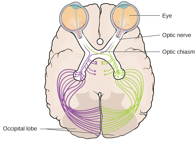 - Optic nerves from both eyes converge in a point below the brain called optic chiasm.